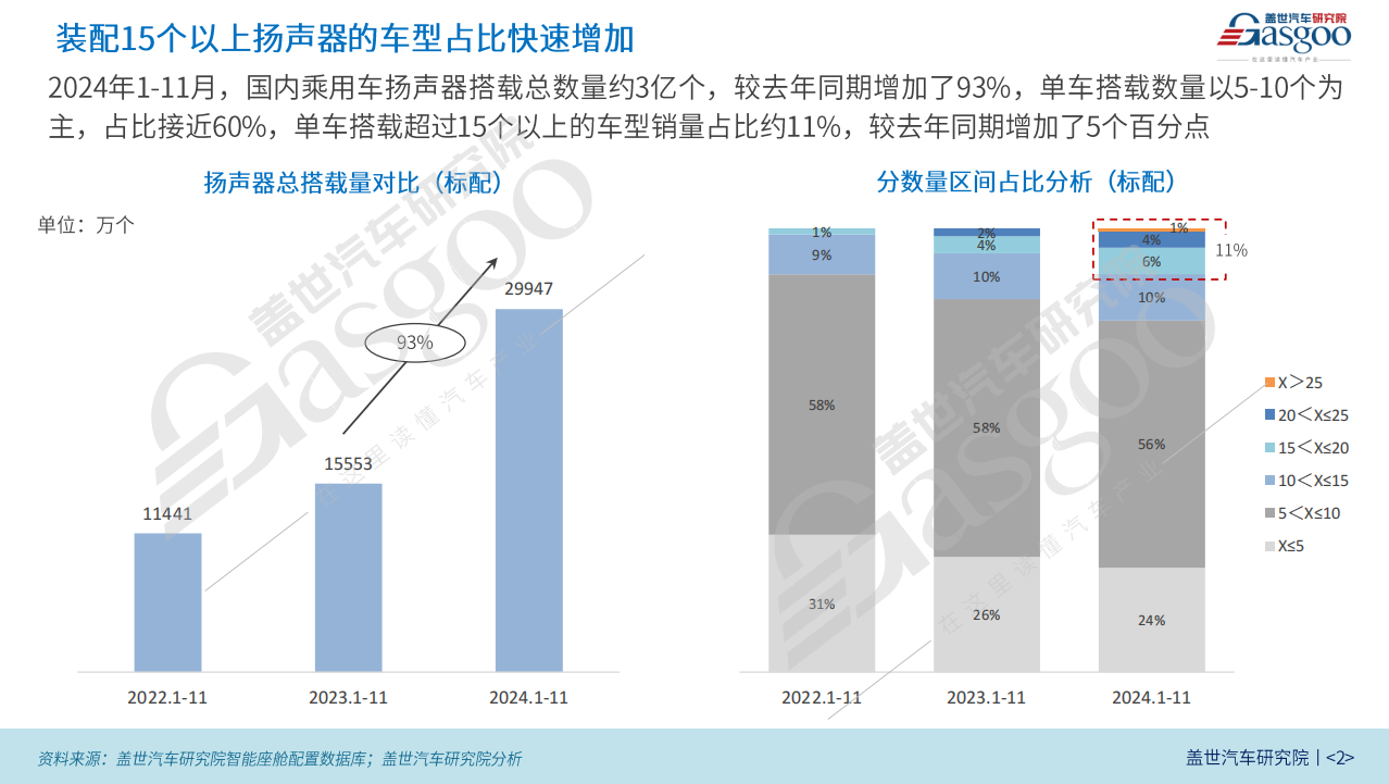 从扬声器搭载总数来看,2024年1-11月,国内乘用车扬声器搭载总数量约3亿个,较去年同期实现了93%的显著增长。其中,装载5-10个扬声器的车型仍为市场主流,占比约56%。而单车搭载超过15个扬声器的车型数量也在迅速攀升,占比已达到11%,与去年同期相比增加了5个百分点。