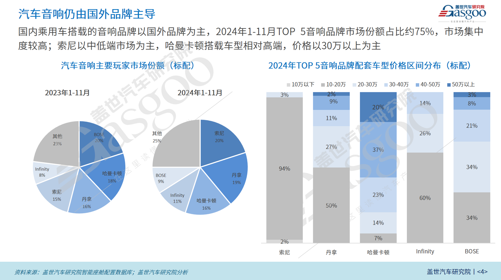 目前,国内乘用车搭载的音响品牌以国外品牌为主。2024年1-11月,TOP 5音响品牌包括索尼、丹拿、哈曼卡顿、Infinity、BOSE等,TOP 5音响品牌市场份额占比约75%,市场集中度较高。其中,索尼以中低端市场为主,哈曼卡顿搭载的车型相对高端,价格以30万以上为主。