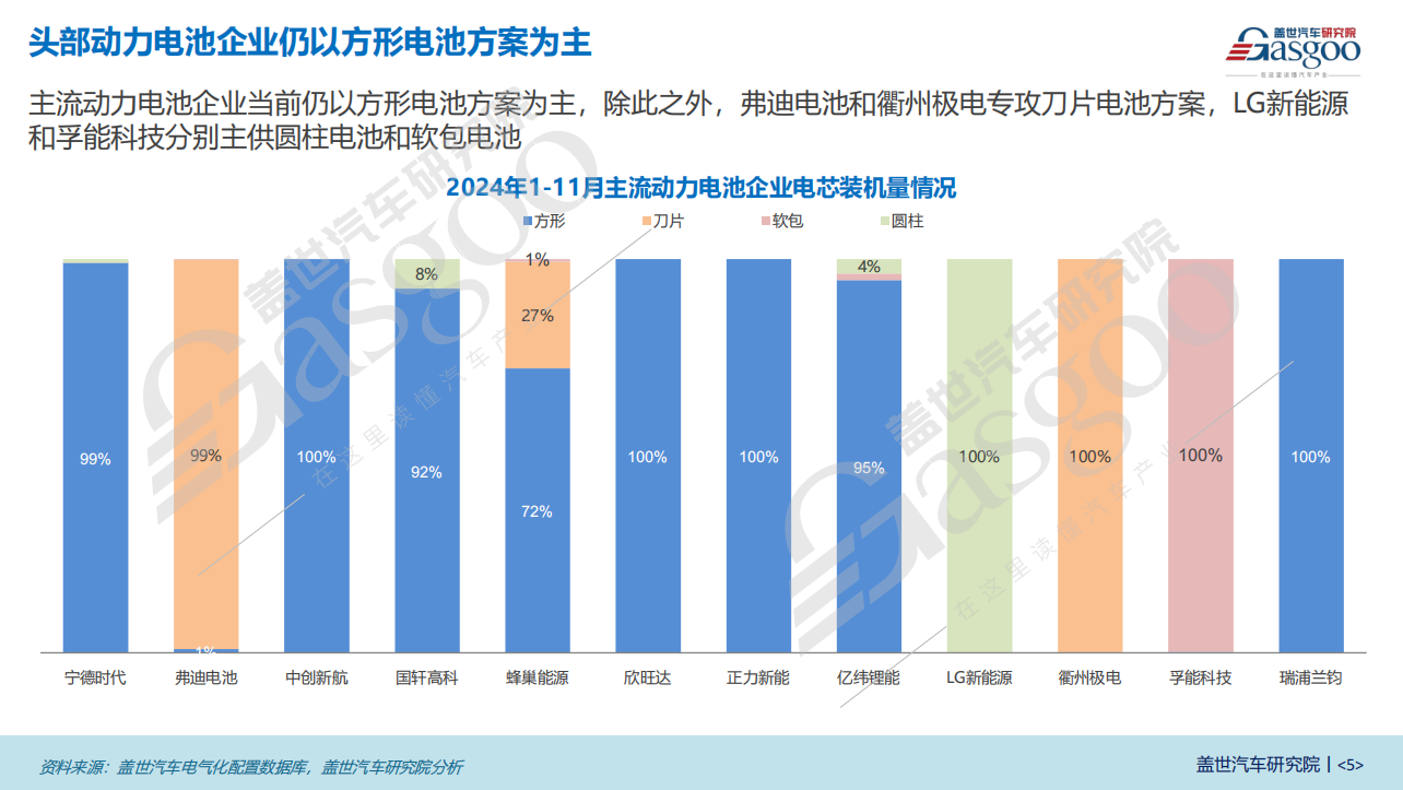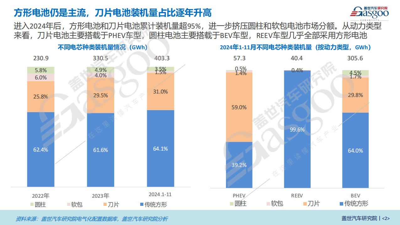从新能源车型来看,刀片电池主要搭载于PHEV车型,2024年1-11月,搭载刀片电池的PHEV车型达到59%。另外,圆柱电池主要搭载于BEV车型,REEV车型几乎全部采用方形电池。