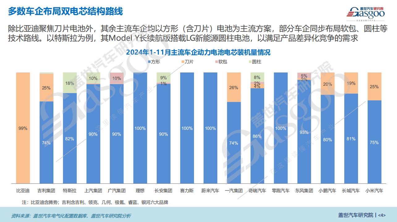 当下,多数车企呈现出双电芯结构路线的布局特点。比亚迪主要聚焦于刀片电池,2024年1-11月的数据显示,比亚迪的刀片电池装机量占比高达99%。除比亚迪外,其余主流车企均以方形(含刀片)电池为主流方案。吉利集团在动力电池电芯布局上,方形电池装机量占比74%,同时也有18%的圆柱电池装机量。在特斯拉的电池装机量构成中,方形电池占比82%,圆柱电池占比18%。上汽集团车型方形电池占比90%,圆柱电池占比10%。