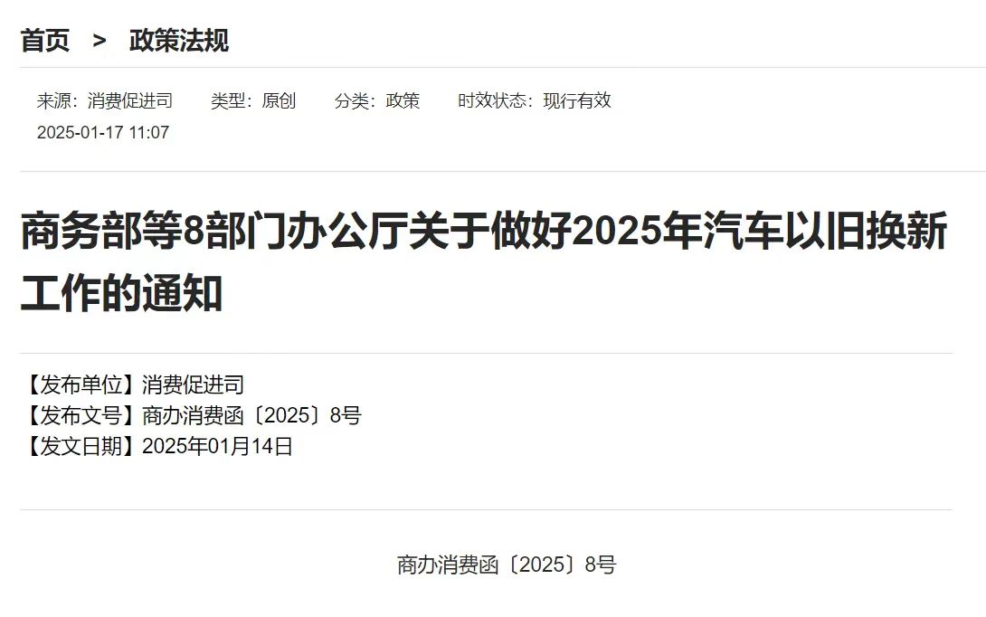 而在2025年“两新”政策顶层设计发布9天之后,1月17日,商务部等八部门办公厅发布《关于做好2025年汽车以旧换新工作的通知》(简称《通知》)。