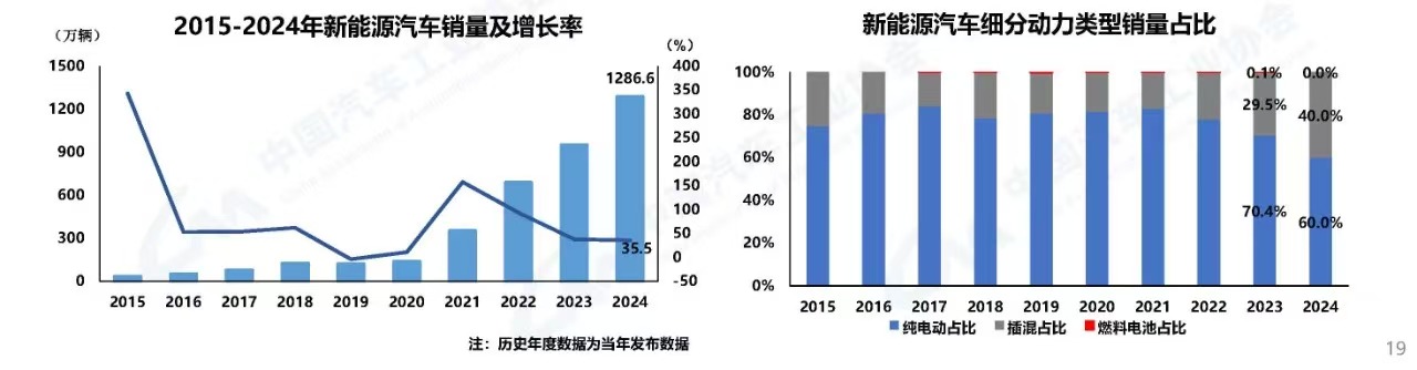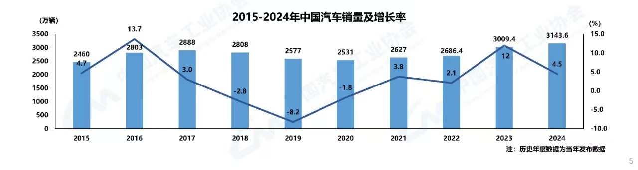 根据中国汽车工业协会发布的年度数据,2024年,我国汽车销量为3143.6万辆,同比增长了4.5%;而新能源汽车销量完成了1286.6万辆,同比增长了35.5%。