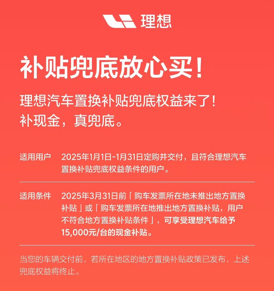 比如,理想宣布在今年1月期间定购并交付理想汽车的用户,如未能在3月31日前获得地方政府的置换补贴,则可享受由理想汽车给予的15000元/台现金补贴。