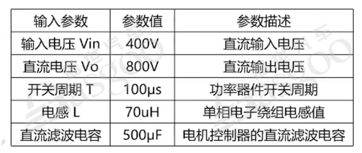 在驱动充电一体化集成器的设计中,电路参数的计算和分析至关重要。以一个具体的例子来说明,假设输入电压Vin为400V,直流输出电压Vo为800V,功率器件开关周期T为100μs,电感L为70μH,直流滤波电容为500μF。根据Boost变换器输入输出电压之间的关系,可以计算出占空比D的变化范围。占空比D的计算公式为D=(Vo-Vin)/Vo,代入上述参数可得D=0.5。