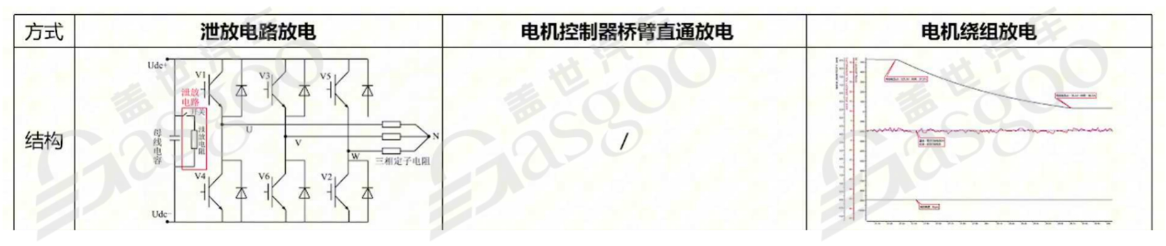 在800V高压系统中,车辆的放电方式主要有泄放电路放电、电机控制器桥臂直通放电以及电机绕组放电三种。