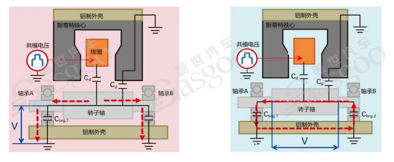 轴电压是由漏电流产生的高频不对称磁场在电机转轴端到端之间产生出的电压。轴承电压则是电机控制器输出的共模电压经电机内部寄生电容的耦合作用,在电机轴承内外圈之间产生的电压。dv/dt轴承电流是功率器件在开关动作瞬间引起轴承电压变化,进而在轴承内部形成的电流。EDM轴承电流是当轴承电压超过轴承油膜耐压阈值时产生的电火花放电类型的电流。高频环路轴承电流是指当轴电压超过电机两侧轴承油膜耐压阈值之和时,产生的环形电流,其路径为从转轴一端到该侧轴承外圈,再到机壳,然后到另一侧轴承外圈,最后回到转轴另一端。