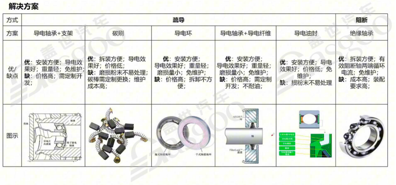 针对高速轴承电腐蚀问题,主要有疏导和阻断两种解决方案。疏导方案包括导电轴承加支架、碳刷、导电环、导电轴承加导电纤维、导电油封等。这些方案的优点是能够将产生的电流及时导走,避免电流在轴承处积聚造成腐蚀。例如,特斯拉在转子轴内嵌小轴承,通过导电片接触轴承内圈导电;日产在中间轴上设置碳刷,减少轴承电腐蚀风险。