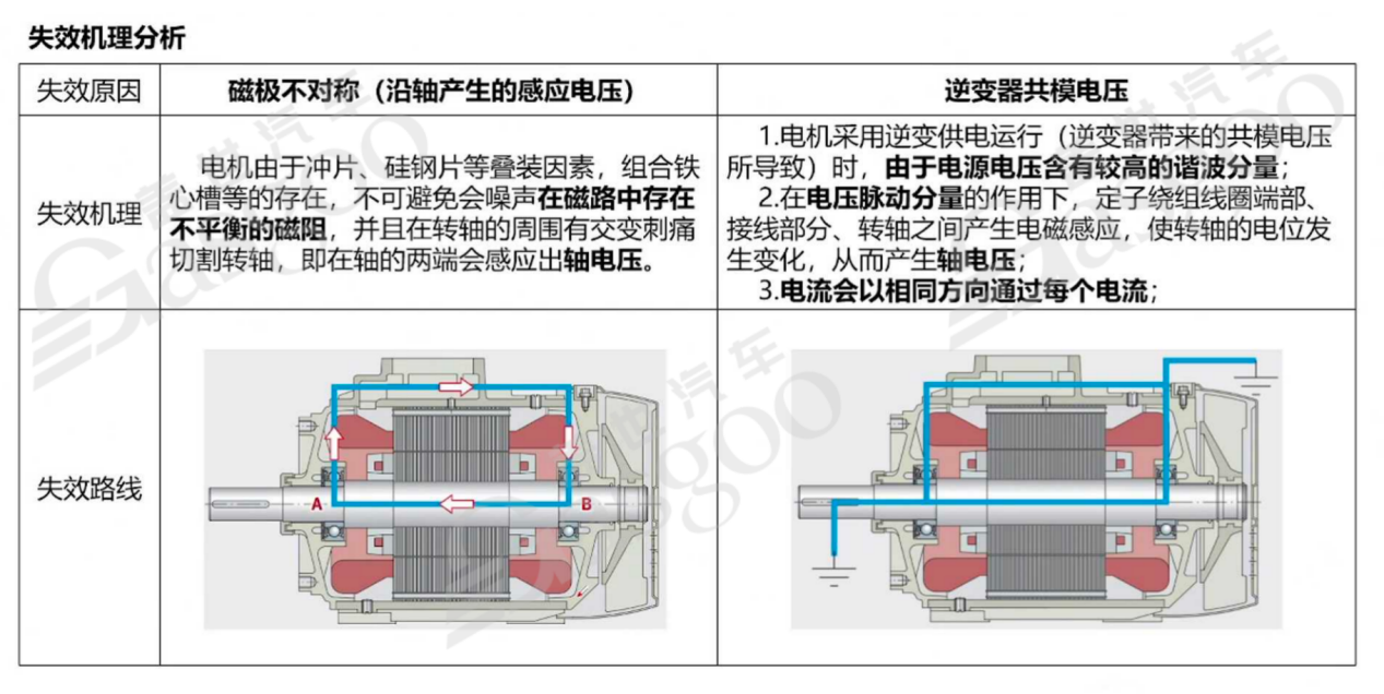 二是逆变器共模电压的影响。当电机采用逆变供电运行时,电源电压含有较高的谐波分量。在电压脉动分量的作用下,定子绕组线圈端部、接线部分、转轴之间会产生电磁感应,使转轴的电位发生变化,从而产生轴电压。目前,逆变器引起的轴承电腐蚀问题较为常见。