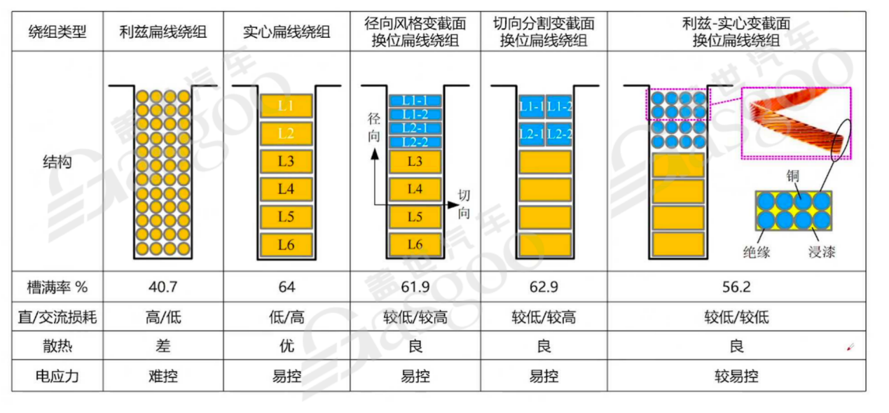 从散热性能来看,传统圆线绕组散热最差,而新型扁线绕组在散热方面具有一定优势,但不同扁线绕组方案之间也存在差异。在定性率方面,传统圆线绕组较难控制,新型扁线绕组相对更容易控制。成长率方面,一些扁线绕组方案在追求在有限空间内装入更多扁线,以实现体积上的优化,从而提升电机的整体性能。