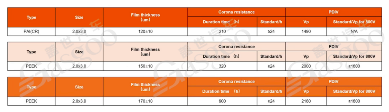 为提高漆包线的耐电晕性能,有两种有效方案。一是提高PDIV值,PDIV值的提升有助于增强漆包线抵抗电晕放电的能力;二是增加耐电晕层,通过在漆包线结构中添加特殊的耐电晕层,可进一步提升其耐电晕性能。不同绝缘材料类型,如PAI(CR)和PEEK,在耐电晕性能上表现各异。以PEEK材料为例,当膜厚为150±10μm时,其PDIV可达2000V,标准时长≥24小时,展现出良好的耐电晕特性。