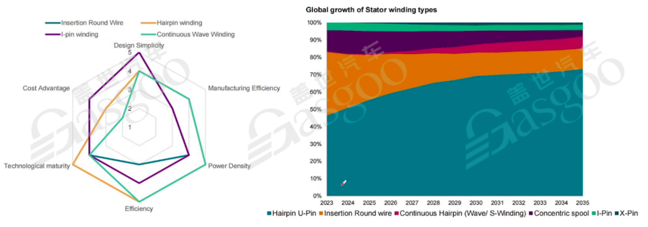 发夹绕组技术源于工业电机,经过不断发展已趋于成熟,在电动汽车领域得到广泛应用。该技术具有显著优势,能够降低铜损耗,提高电机效率。同时,发夹绕组在设计上实现了制造效率与性能的平衡,尽管其制造工艺相较于传统缠绕技术更为复杂,但在性能与成本之间达到了较好的权衡,因此受到众多供应商和车企的青睐。