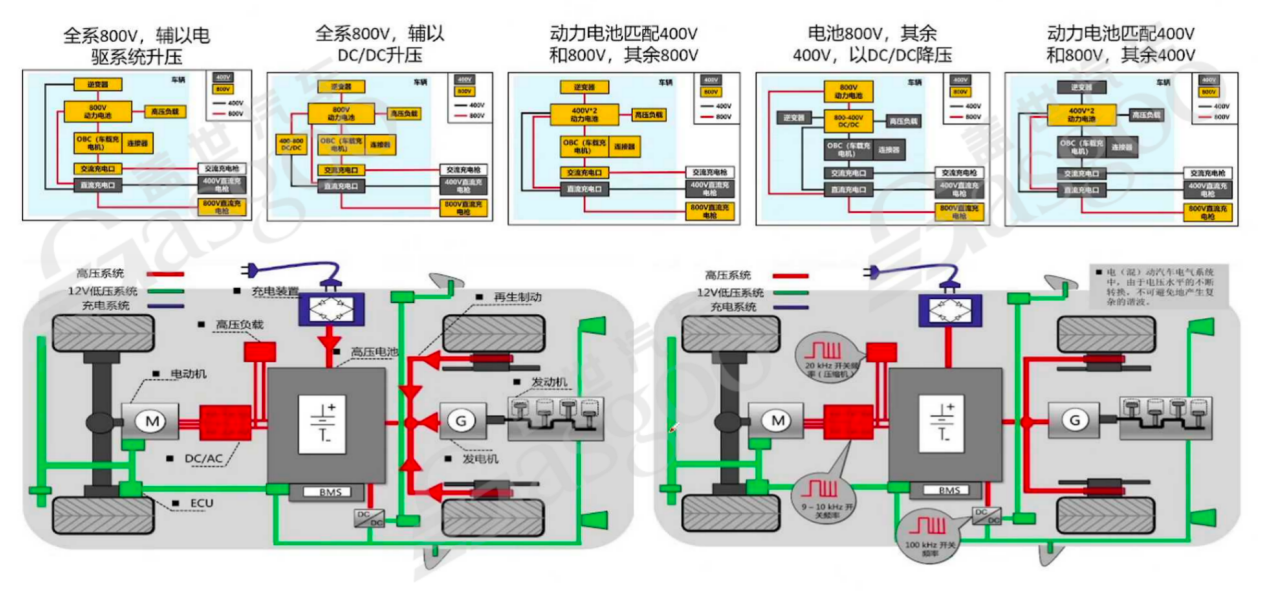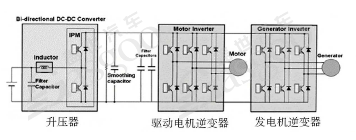 在800V高压系统中,Boost调压升压器布置在逆变器和动力电池之间,其主要功能是实现对电机系统工作电压的动态调节。升压器既可以将动力电池电压升高,满足电机在不同工况下对高电压的需求,又能够将逆变器端电压降低后给动力电池充电。