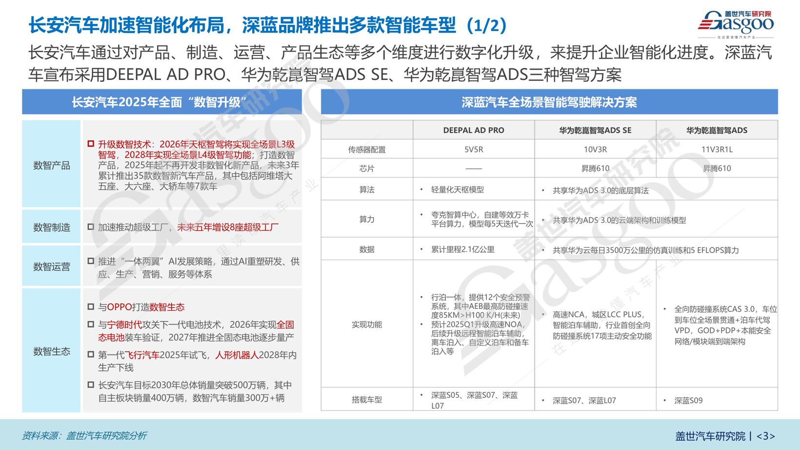 2025年,长安汽车全面加速智能化布局,通过对产品、制造、运营、产品生态等多个维度进行数智升级,以整体提升企业智能化进度。包括计划于2026年实现天枢智驾全场景L3级智驾,2028年实现全场景L4级智驾功能。加速推进超级工厂建设,与OPPO、宁德时代联合打造数智生态等,全面推进技术迭代与产品革新,进一步增强市场竞争力。
