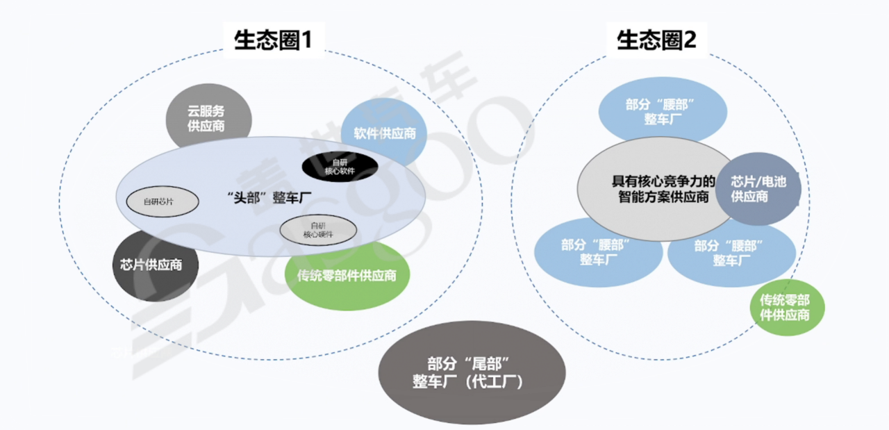 生态圈2中,具有核心竞争力的智能方案供应商,如华为,与整车厂合作,带动了像赛力斯这样的企业发展。赛力斯在传统零部件采购方面依赖传统供应商,在智能驾驶和智能座舱等核心技术上借助华为的力量,实现了快速发展。不同生态圈中的企业相互竞争与合作,共同推动行业的发展和变革。