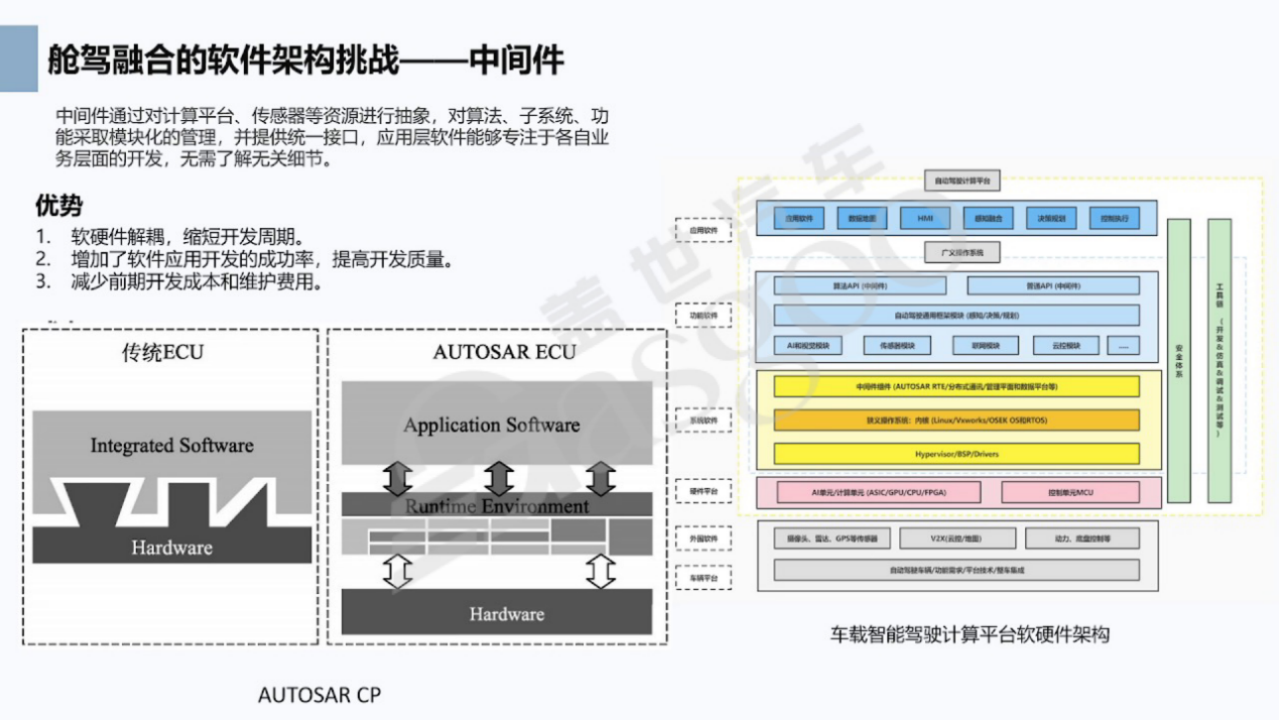 中间件技术也是舱驾融合的重要支撑。传统的ECU开发耦合度高,而中间件通过对计算平台、传感器等资源进行抽象,对算法、子系统、功能采取模块化管理,并提供统一接口。以AUTOSAR CP的RTE为例,它作为中间件,使得开发者无需关注底层细节,如摄像头驱动型号等。在开发过程中,开发者只需向中间件请求所需资源,中间件会负责适配和提供,实现了软硬件解耦。这不仅缩短了开发周期,还提高了软件应用开发的成功率和质量,降低了前期开发成本和维护费用。