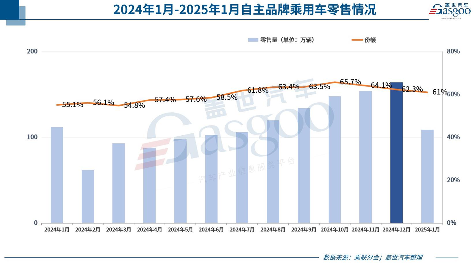 该月,自主品牌国内零售份额达到了61%,同比增长5.9个百分点。如果从批发来看,自主品牌市场份额更是达到了69%,较去年同期增长8个百分点。