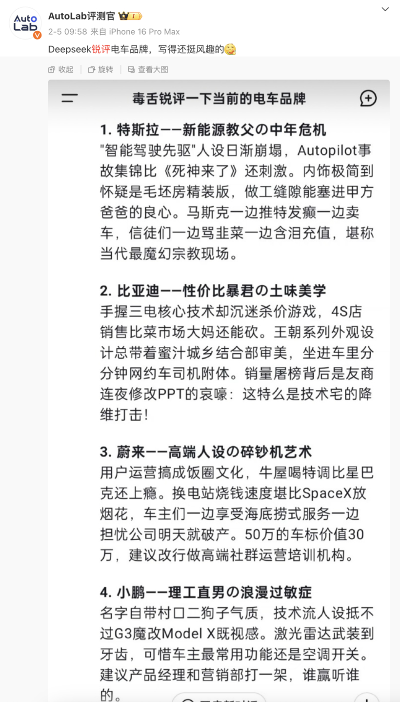 甚至就连我们的老本行做车评也是有模有样,锐评各大电车厂商也是写得非常幽默风趣。