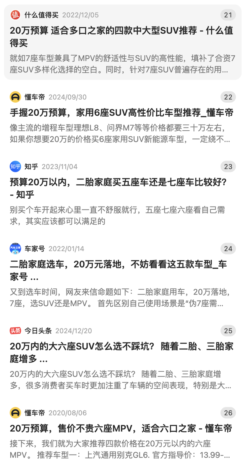 规则很简单,我们开启了DeepSeek的“联网搜索”功能,让它“假装”自己是汽车业的业内人士,为小白们挑选出最合适的车型。