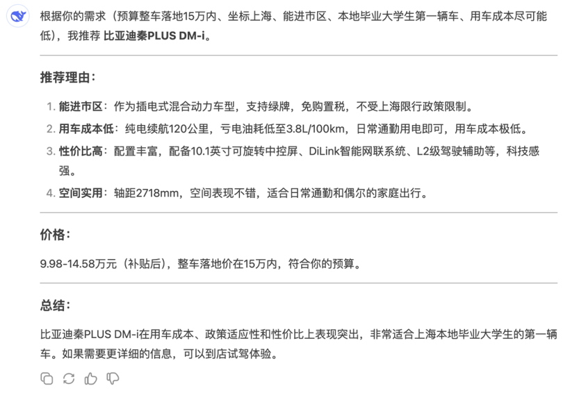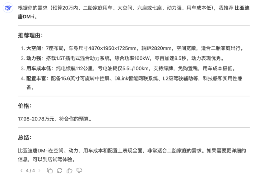 在这里,DeepSeek向我们推荐了比亚迪唐DM-i,它的总结是“比亚迪唐DM-i在空间、动力、用车成本和配置上表现全面,非常适合二胎家庭的需求。”