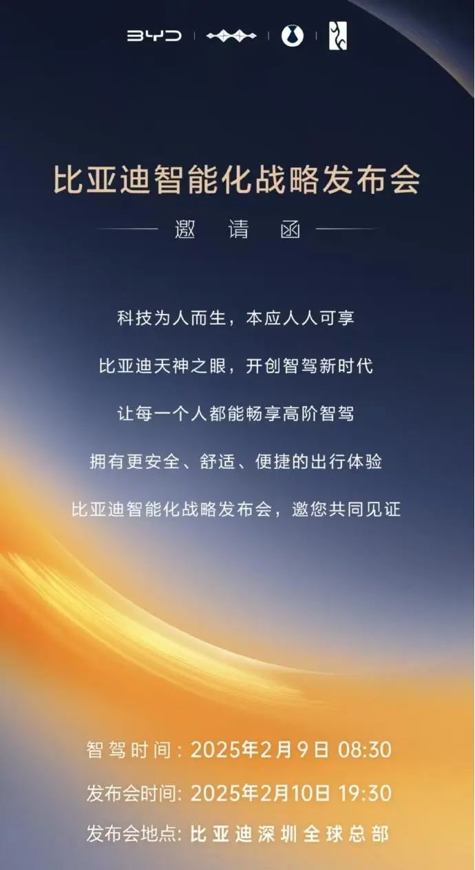 因为比亚迪发布消息称,将于2月10日发布“天神之眼”高阶智驾系统,基于全球首个整车厂自研车载计算平台与BOS操作系统,实现端到端全栈自研突破。