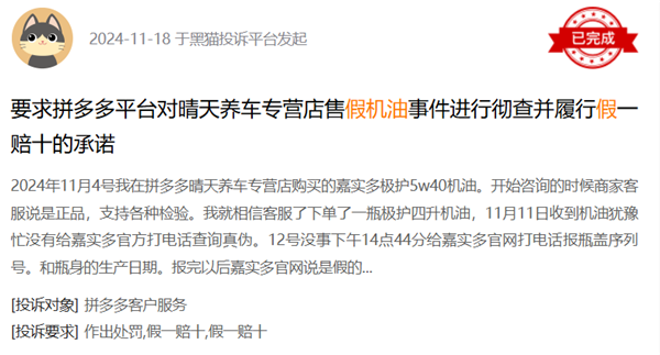 “假机油不是假一赔十吗?拼多多客服让我将机油寄回总部鉴定。后来告知机油是真的,但是怎么鉴定的却不说。”上述车主说到。