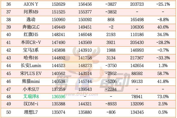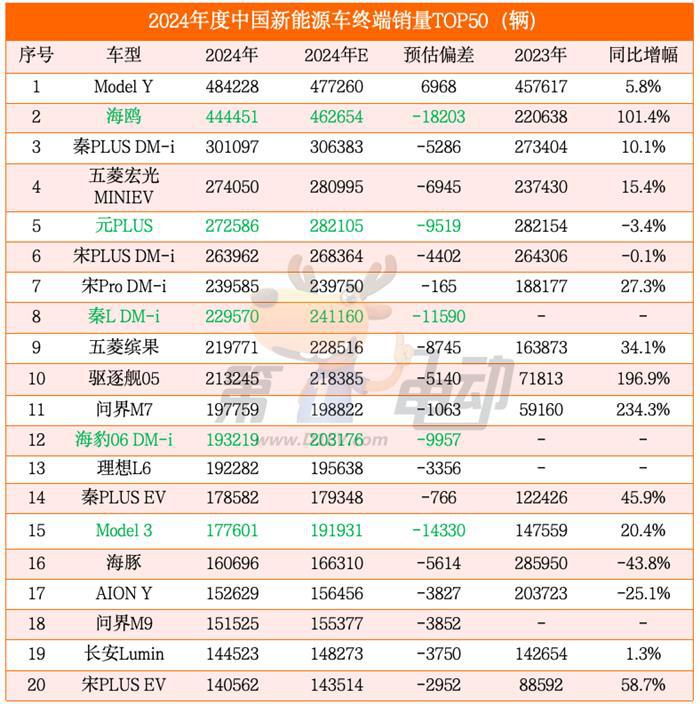 值得注意的是,小鹏M03和吉利星愿这两款一上市即爆款的车型,由于上市时间在今年8月份以后,所以未进入2024年度新能源车榜单TOP50。