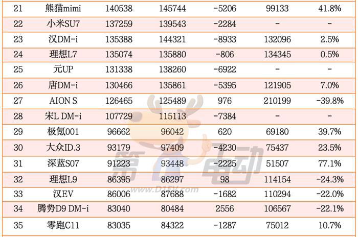 而元PLUS、宋PLUS DM-i、海豚和AION Y四款新能源车终端销量出现下滑,尤其是海豚大降近44%,AION Y大降超25%。