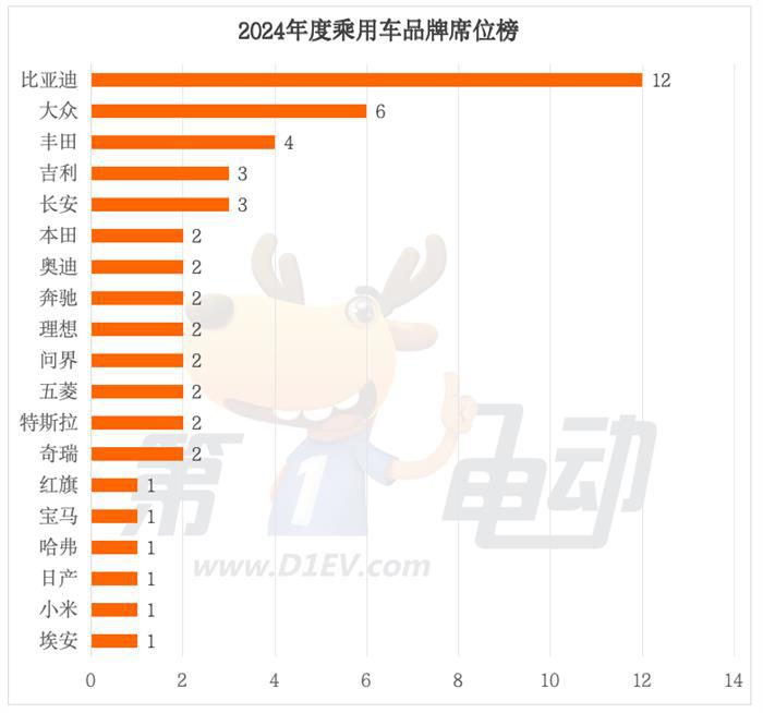 特斯拉、五菱、问界、理想、奔驰、奥迪、本田和奇瑞各占2席,埃安、小米、红旗、日产、哈弗、宝马各占1席。