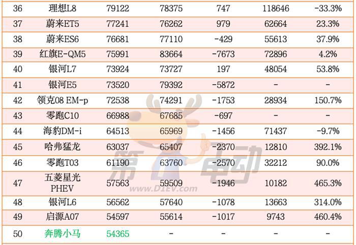 排名第50位的奔腾小马月销量达到了4,530辆,这可以被视为新能源汽车在市场上生存的一个关键门槛。如果一款车型的月销量无法达到4,530辆,那么它被淘汰的几率将大大提升。