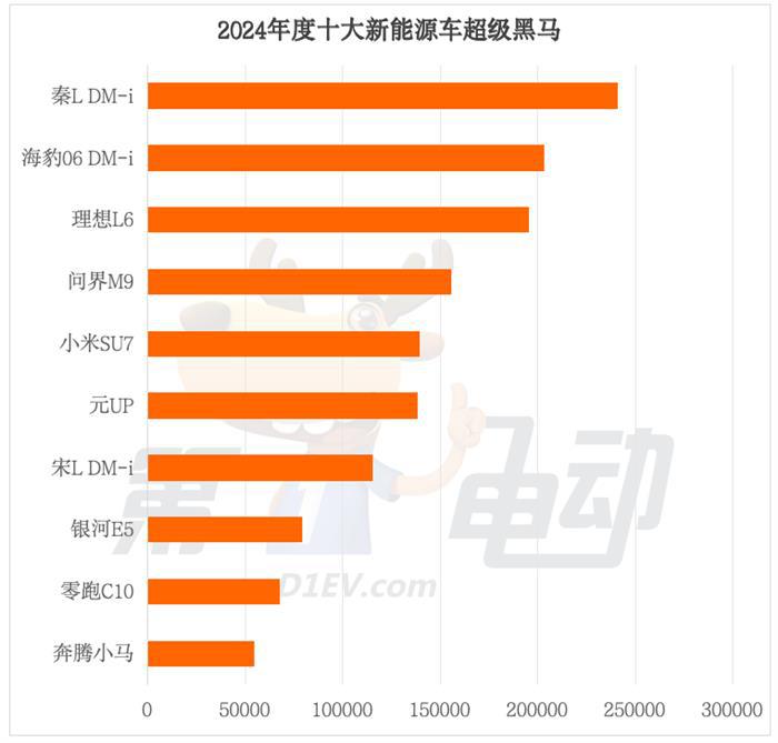 秦L DM-i、海豹06 DM-i、理想L6、问界M9、小米SU7、元UP六款新能源车新上榜,成为2024年度中国汽车新晋黑马。同时,海鸥、驱逐舰05、问界M7终端销量同比实现翻倍暴涨。