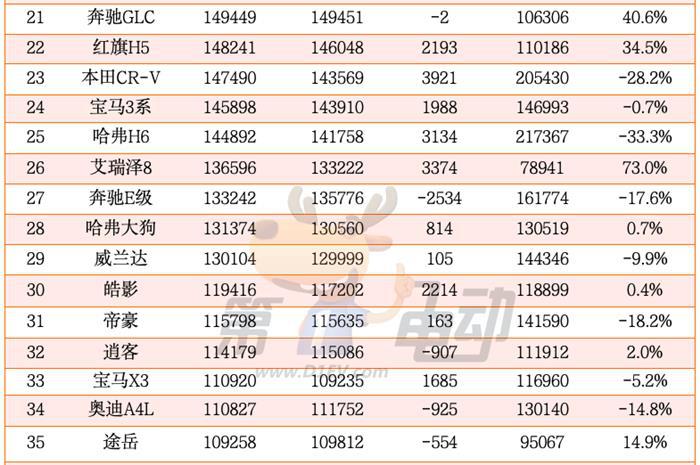 25款燃油车中,艾瑞泽8、星越L、瑞虎8终端销量实现超50%的大涨,尤其是艾瑞泽8(预估稿中未列入)同比大涨73%。而曾经的神车轩逸、速腾、长安CS75 PLUS、凯美瑞、逸动、雅阁、本田CR-V、宝马3系、哈弗H6九款车终端销量同比均出现下滑。