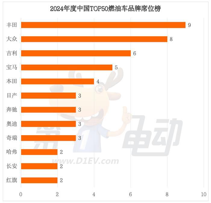 纵观燃油车TOP50榜,共12个品牌上榜。其中,丰田占9款,大众占8款,吉利占6款,宝马占5款,本田占4款,奇瑞、奥迪、奔驰、日产各占3款,红旗、长安和哈弗各占2款。