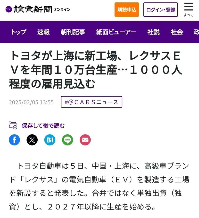丰田中国于2月5日发布公告,丰田与上海市达成绿色低碳发展战略合作意向,计划在上海金山区新设雷克萨斯纯电动汽车及电池的研发/生产公司,第一款纯电动车型最快于2027年投产。