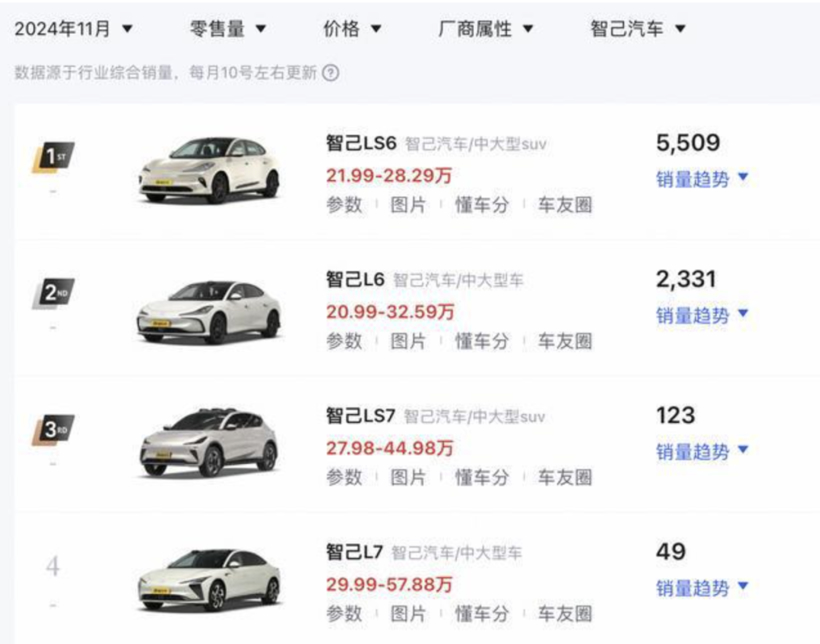 从产品角度来看,目前智己旗下拥有L6、LS6、L7和LS7四款纯电产品,它们覆盖了轿车、SUV、轿跑SUV等多种品类,主销车型为LS6和L6。其中,LS6的11月销量处于5000辆,在中大型纯电SUV中排名前十,排名第一的理想L6月度销量突破2.4万辆。
