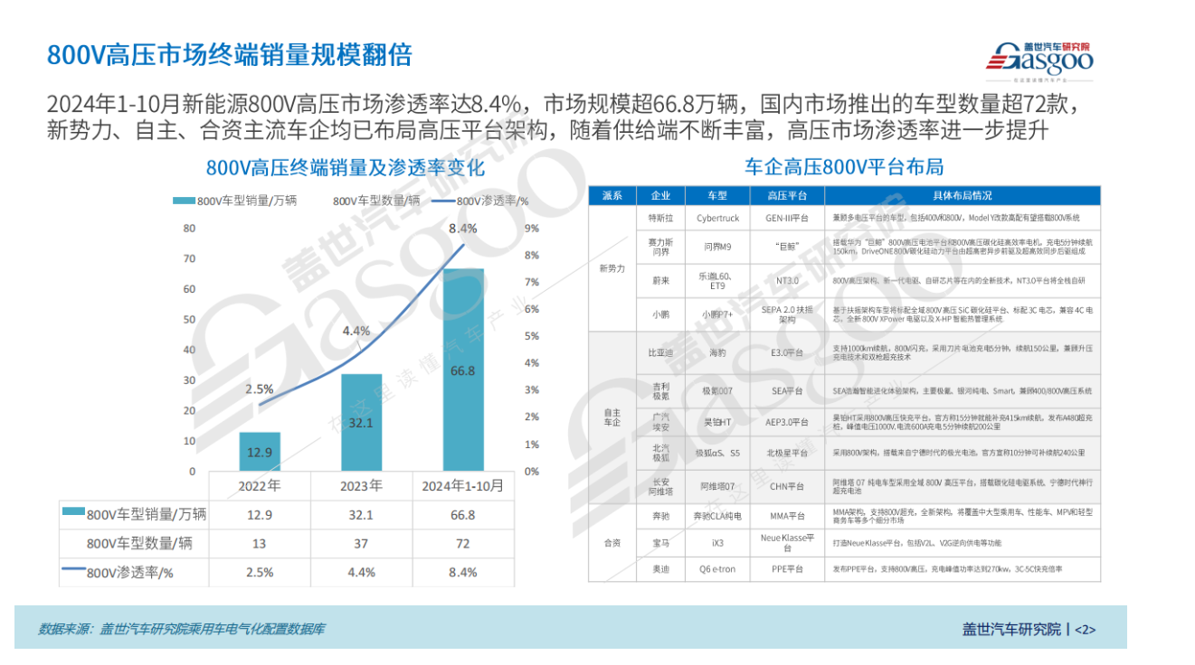 从国内市场来看,2022年800V高压技术在新能源汽车市场渗透率仅为2.5%,终端销量为12.9万辆,2023年渗透率提升至4.4%,终端销量增长到32.1万辆,2024年1-10月,渗透率达到8.4%,终端销量翻番,高达66.8万辆。