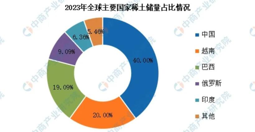 按照汽车公社查阅《2024-2029年中国稀土行业市场发展前景研究报告》的数据,2023年全球稀土资源分布中,中国储量占比达40%,其次分别为越南、巴西、俄罗斯、印度,占比分别为20.00%、19.09%、9.09%、6.36%。