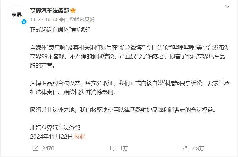 就在11月,享界汽车法务部发布消息,为捍卫品牌合法权益,决定起诉“飞坡”当事人袁启聪。此举激起轩然大波,引发网友热议和广泛关注,但该事件目前尚没有定论。