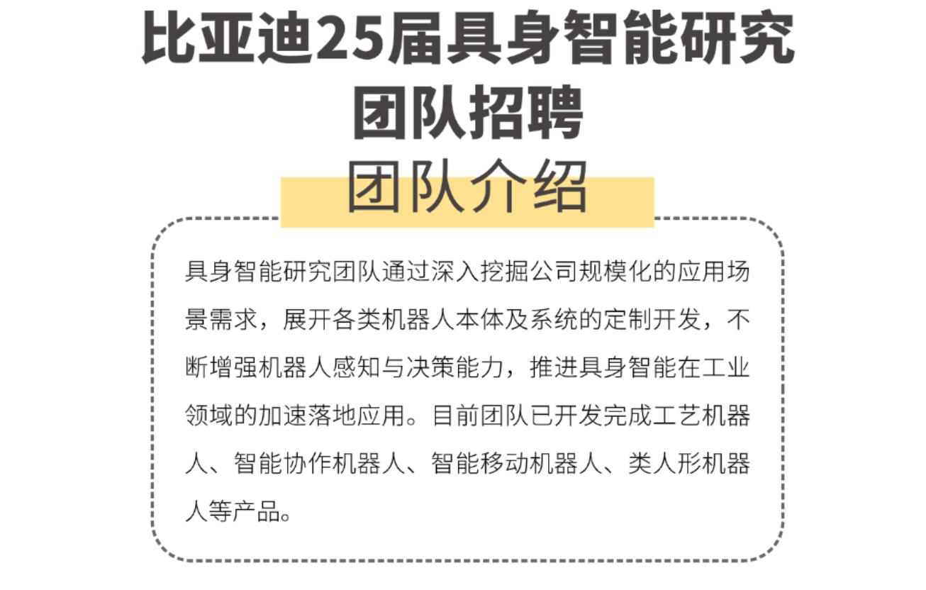 比亚迪招聘官方公众号近日发布2025届具身智能研究团队专场招聘,面向机器人领域招募高级算法工程师、高级结构工程师、高级仿真工程师、高级硬件工程师等岗位。
