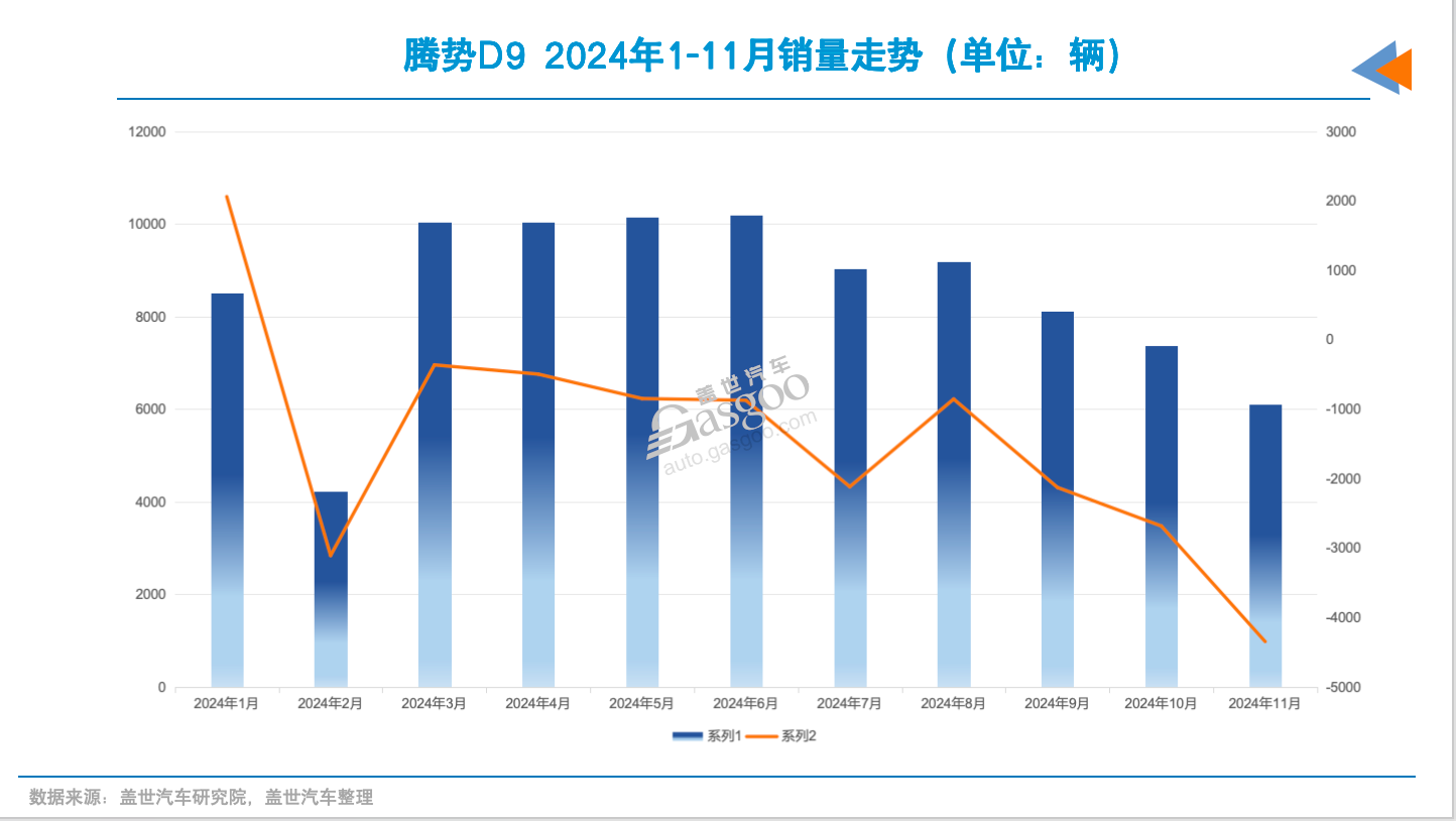 2022年下半年后,MPV市场格局发生巨变。除了丰田赛那等新晋油车对手外,腾势D9的横空出世彻底打破了原有格局。这款新能源黑马仅用一年时间就与别克GL8形成势均力敌之势,2023年更是以12万辆的销量超越别克GL8拿下高端MPV市场冠军。