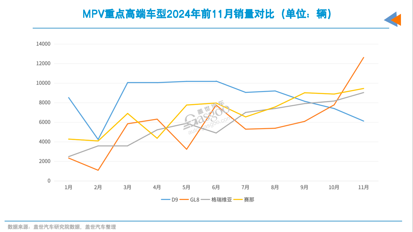但值得注意的是,别克GL8已经难回以往一家独大的局面。目前,高端MPV市场,是别克GL8、腾势D9、赛那、格瑞维亚四强格局。