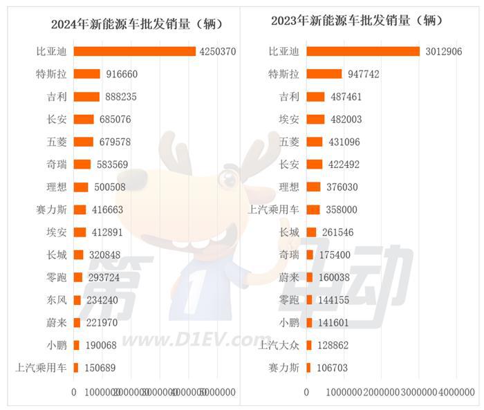 比亚迪、吉利、长安、奇瑞、理想、赛力斯、零跑、东风、蔚来、小鹏等车企2024年销量均创新高。尤其是奇瑞、赛力斯、零跑销量同比均实现翻倍暴涨,吉利、长安、五菱销量同比大涨超50%。