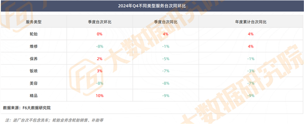 在第四季度,轮胎业务的表现亮眼,台次实现了4%的同比增长。而保养、钣喷、美容、精品业务台次同比均出现较大幅度下滑,降幅均超5%。