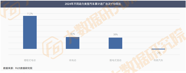 据F6数据显示,2024年,传统汽车累计进厂台次同比下滑2%,而不同动力类型新能源汽车台次同比均有所增长,其中增程式电动以112%的同比增速遥遥领先。