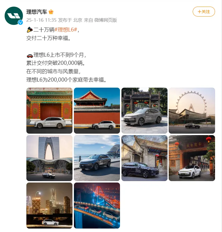 1月16日,理想汽车宣布,旗下的L6车型上市不到9个月,累计交付突破20万辆。
