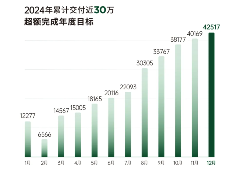 据零跑汽车此前公布数据,四季度零跑共计交付新车120,863辆,其中11月和12月连续两个月突破4万辆,持续创下月交付量新高。至此2024全年,零跑累计交付新车293,724辆,超额完成年度目标,相较于2023年同期的144,155辆,增长104%。