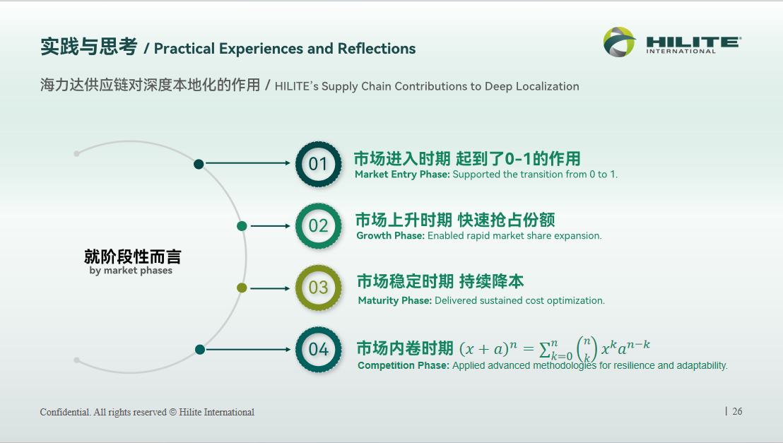 张悦提到,在供应链本地化的实践中,海力达经历了从市场开拓期的快速响应到市场成熟期的降本增效,再到疫情后市场竞争加剧的应对阶段。当前,海力达的原材料成本结构和供应链灵活性,确保了公司在新业务拓展和项目执行中的高效表现。