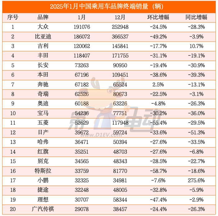 ▍大众再超比亚迪夺冠!小鹏、吉利同比逆势大涨