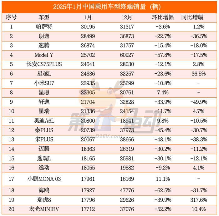小米SU7、星愿和小鹏MONA 03成为2025年新晋超级黑马,首次跻身榜单前20,尤其是吉利星愿和小鹏MONA 03终端销量环比均实现逆势上涨。