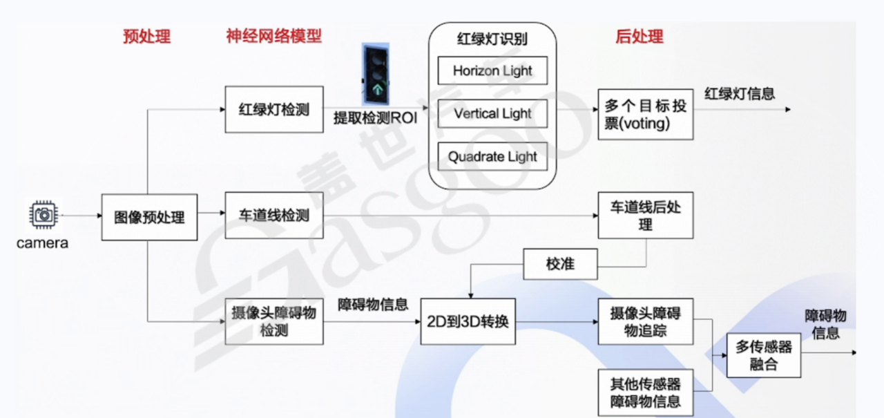 视觉感知算法主要由图像的预处理、神经网络模型和后处理三部分组成。预处理阶段对输入图像进行整合和前处理,为后续模型输入做准备;神经网络模型涉及深度学习算法,包含目标检测、语义分割、图像分类等多种功能;后处理则利用传统算法优化网络模型的输出效果。