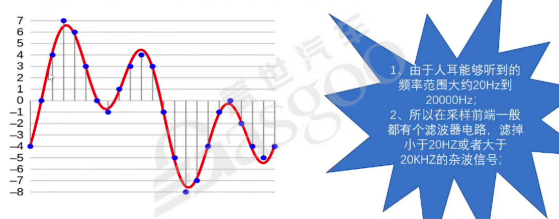 1.采样:采样是按照特定时间间隔在连续的音频波上进行取值的操作,由采样器完成。采样器在不同信号处理场景下,既可以是一个子系统,也可以指一个操作过程或算法。理想的采样器应尽可能避免信号失真。由于人耳可听频率范围大约在20Hz到20000Hz之间,因此在采样前端通常会设置滤波器电路,用于滤除小于20Hz或大于20kHz的杂波信号。这些杂波信号既无法被人耳感知,又会占用存储空间,所以需要去除。